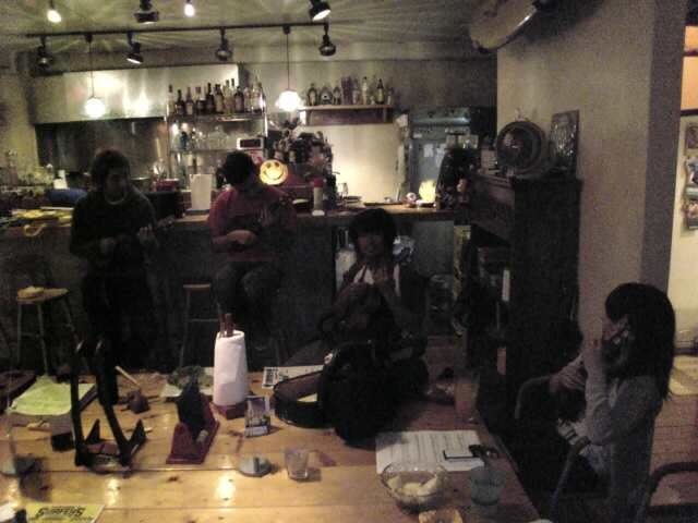 UKULERIANSメンバーはタカちゃん、さきっぽ、$$、そして仕事で一時間遅れの
