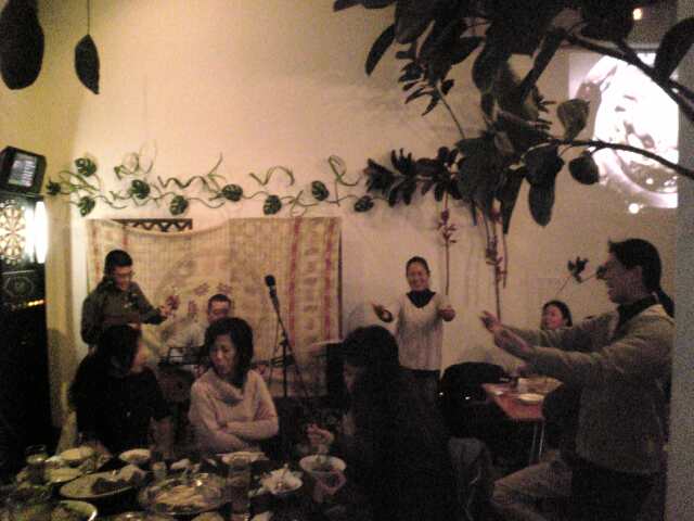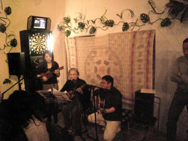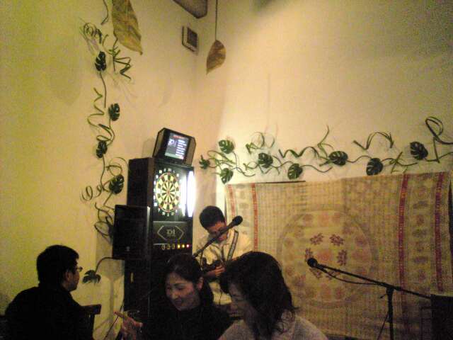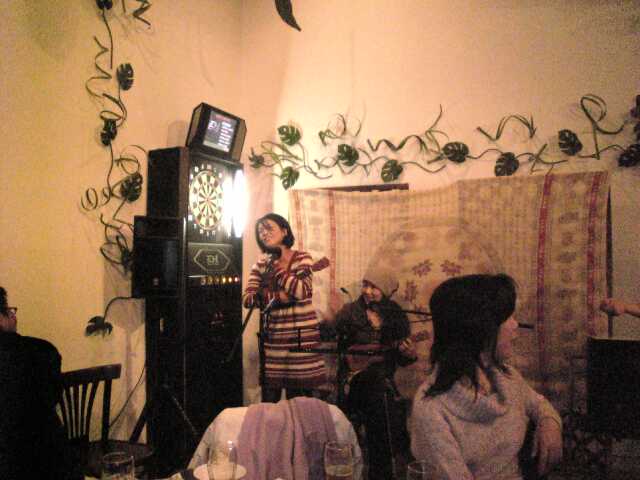 MayoMayoが最初のイントロを弾くと、つかみはオッケーみたいな雰囲気に…で、私がストロークで弾いたんですが、緊張と酔いで途中コードがわからなくなったり(T_T) 来る前の練習ではいい感じに弾けたのに残念! もっと経験が必要ですね